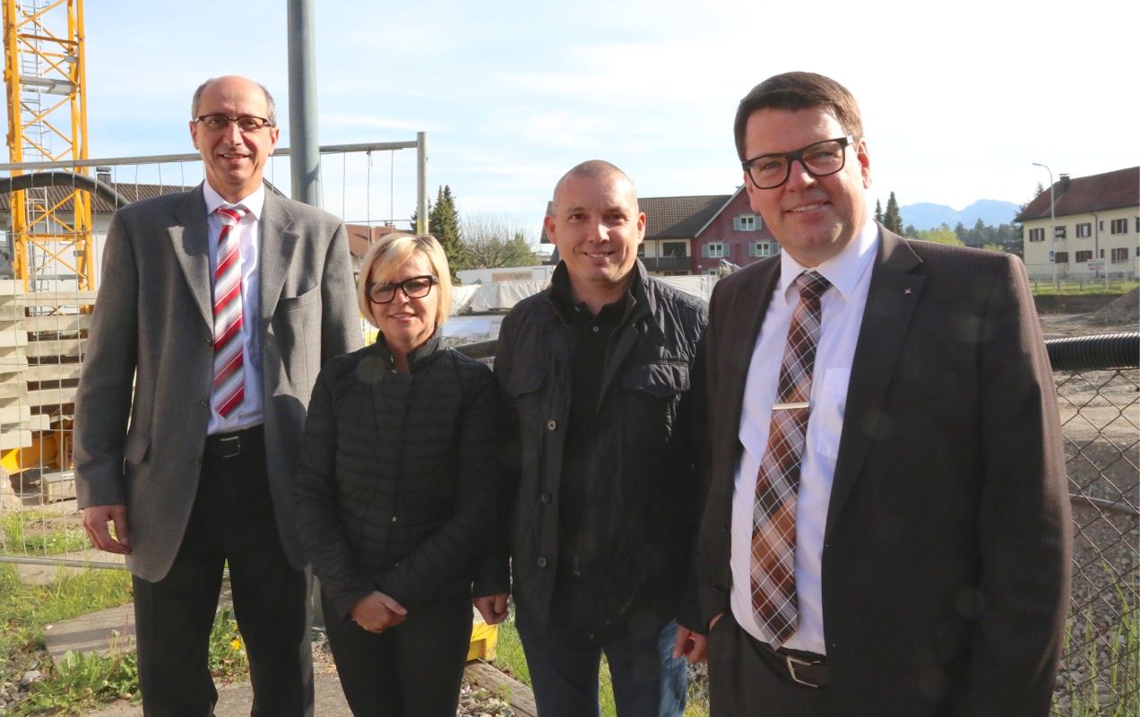 Prok. Werner Gopp und Vorstandsdirektor Stefan Vetter und von der Raiba Feldkirch mit den Bauherrn Anita und Wolfgang Linher