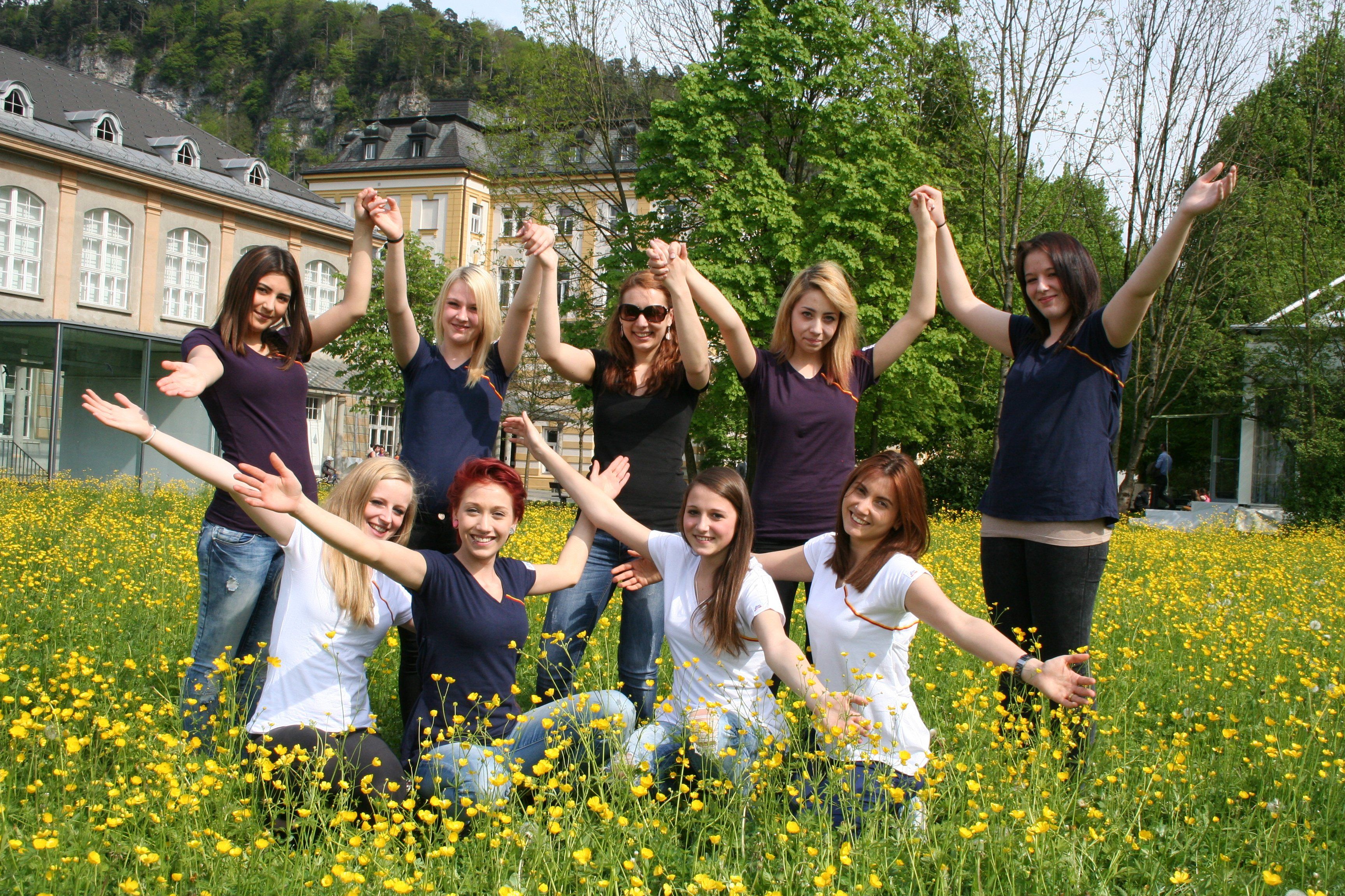 Wiese vor dem Reichenfeld: Die Lehrlinge Anja, Berna, Justine, Stefanie, Michelle, Esra, Sandra, und Sara beim Proben ihrer Präsentation.