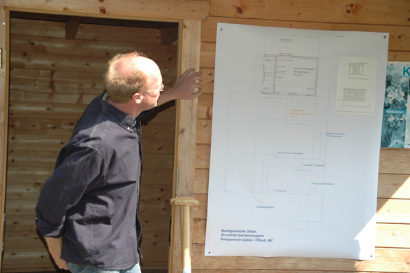 Bernhard Amman erklärt die Baupläne für den neuen Geräteraum und die WC Anlage