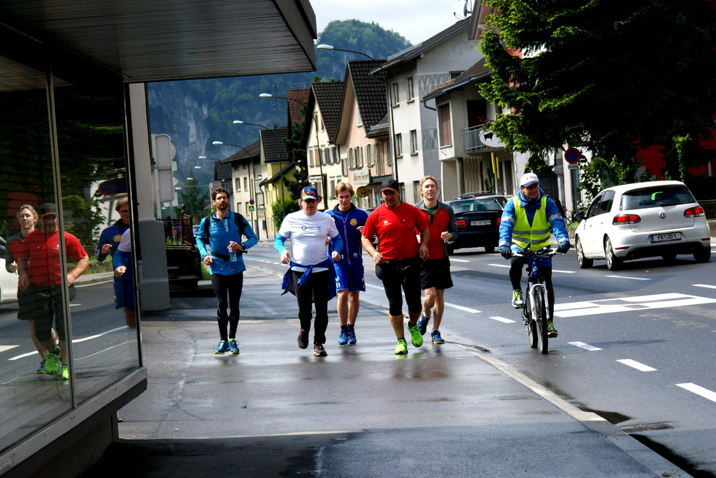 Die Läufer treffen in Hohenems ein, Robert Franz, Dieter Heidegger, Justin Taylor, Patrick Erhart, Stefan Keckeis