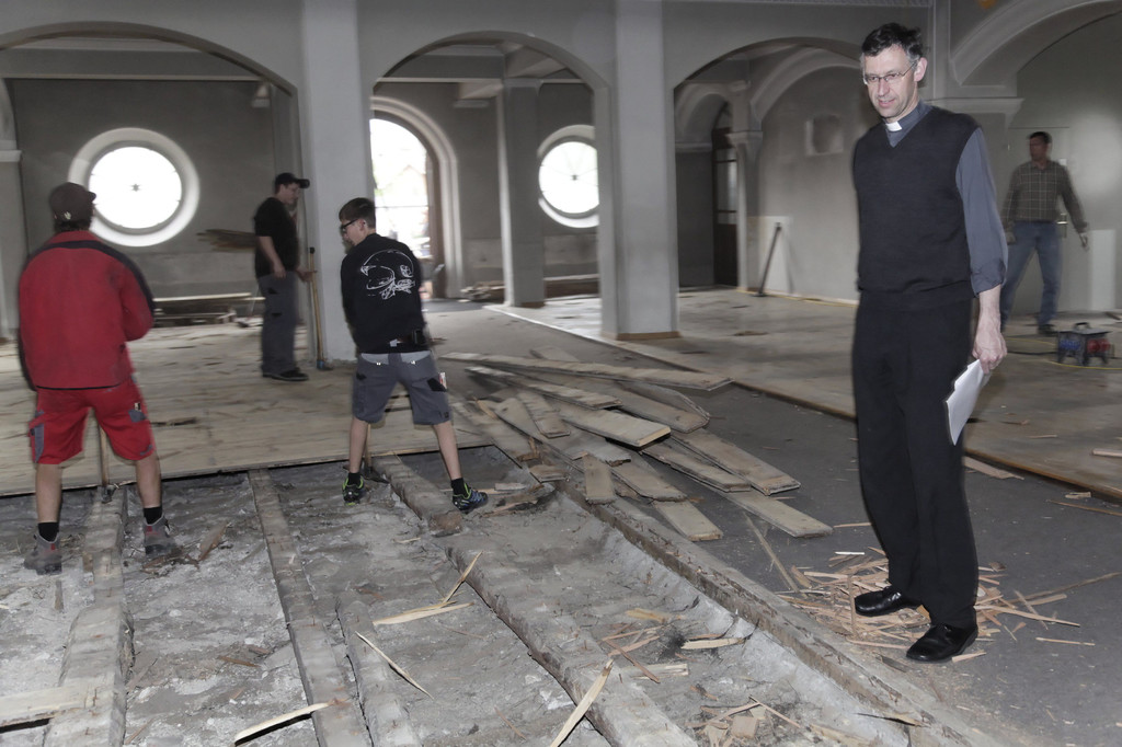 Bagger und Pressluftbohrer in der Kirche