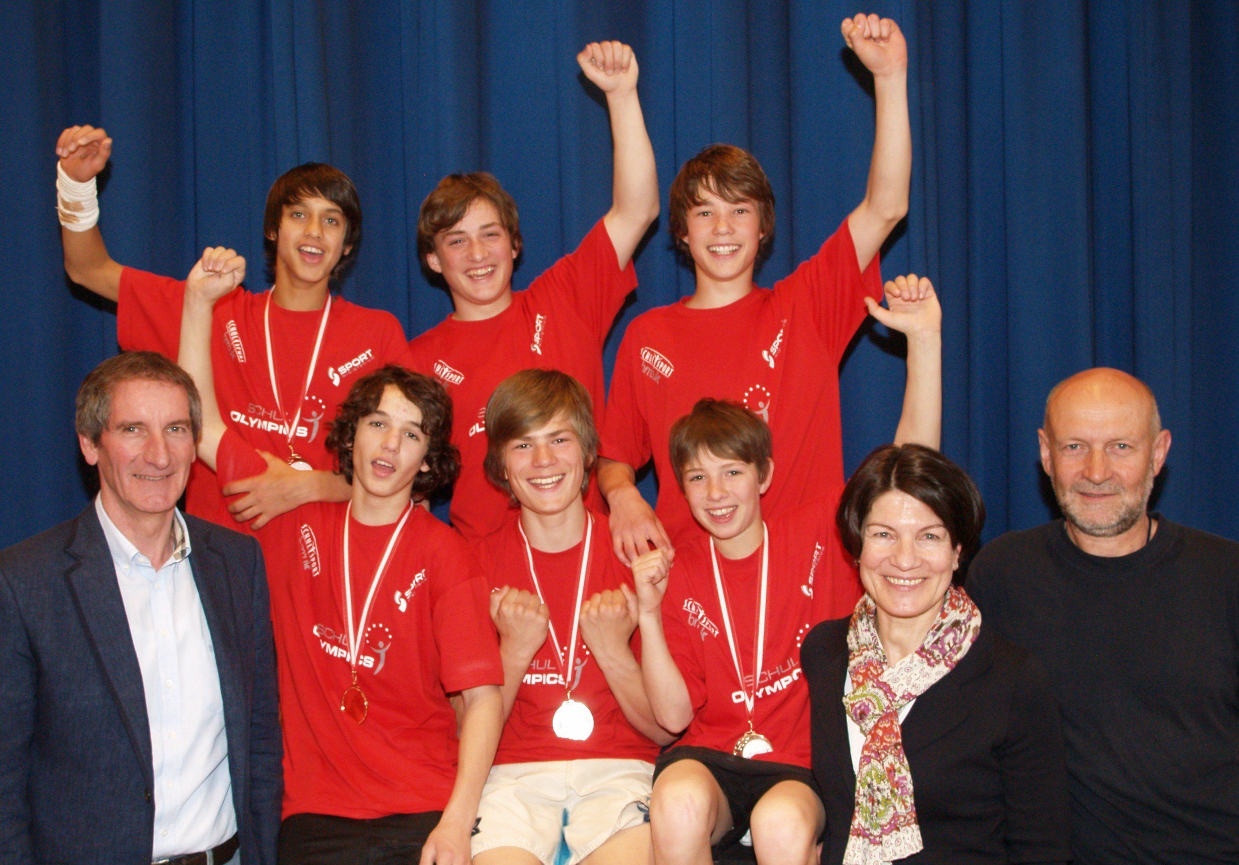 Die Turner der VMS Zwischenwasser mit Bürgermeister Josef Mathis, Direktorin Monika Drexel und Sportlehrer Werner Gerold