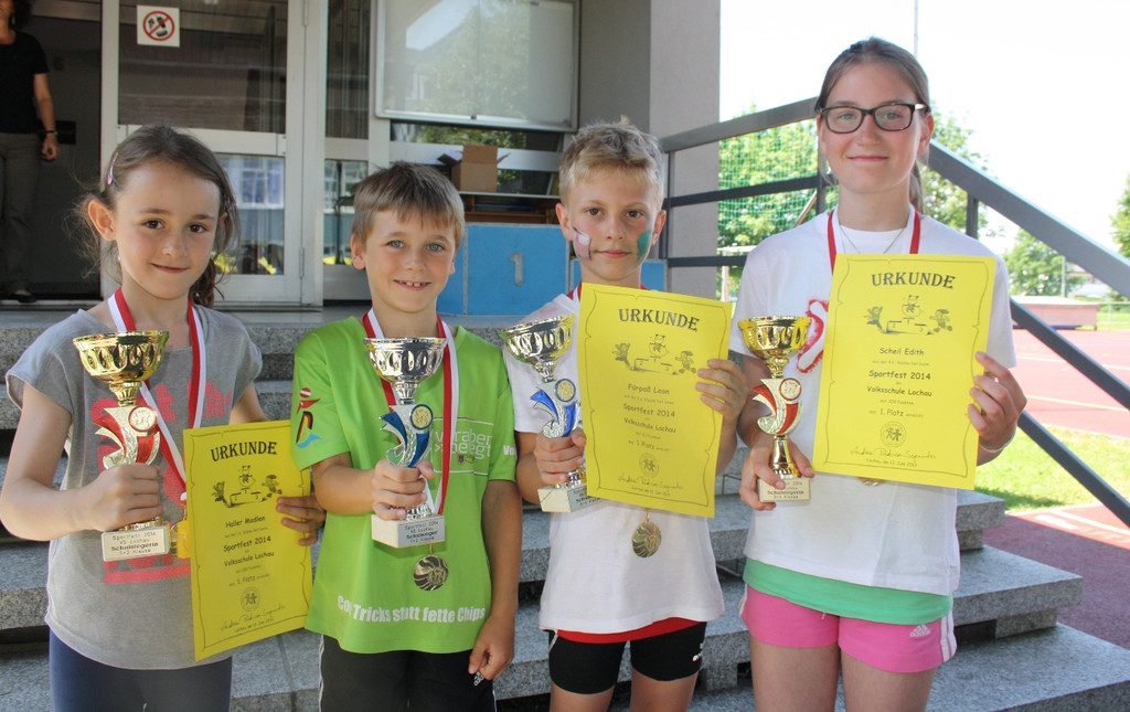 Die Schulsieger Madlen Haller (Mädchen 1./2. Klassen), Alexander Maringgele (Knaben 1./2. Klassen), Leon Fürpaß (Knaben 3./4. Klassen) und Edith Scheil (Mädchen 3./4. Klassen).