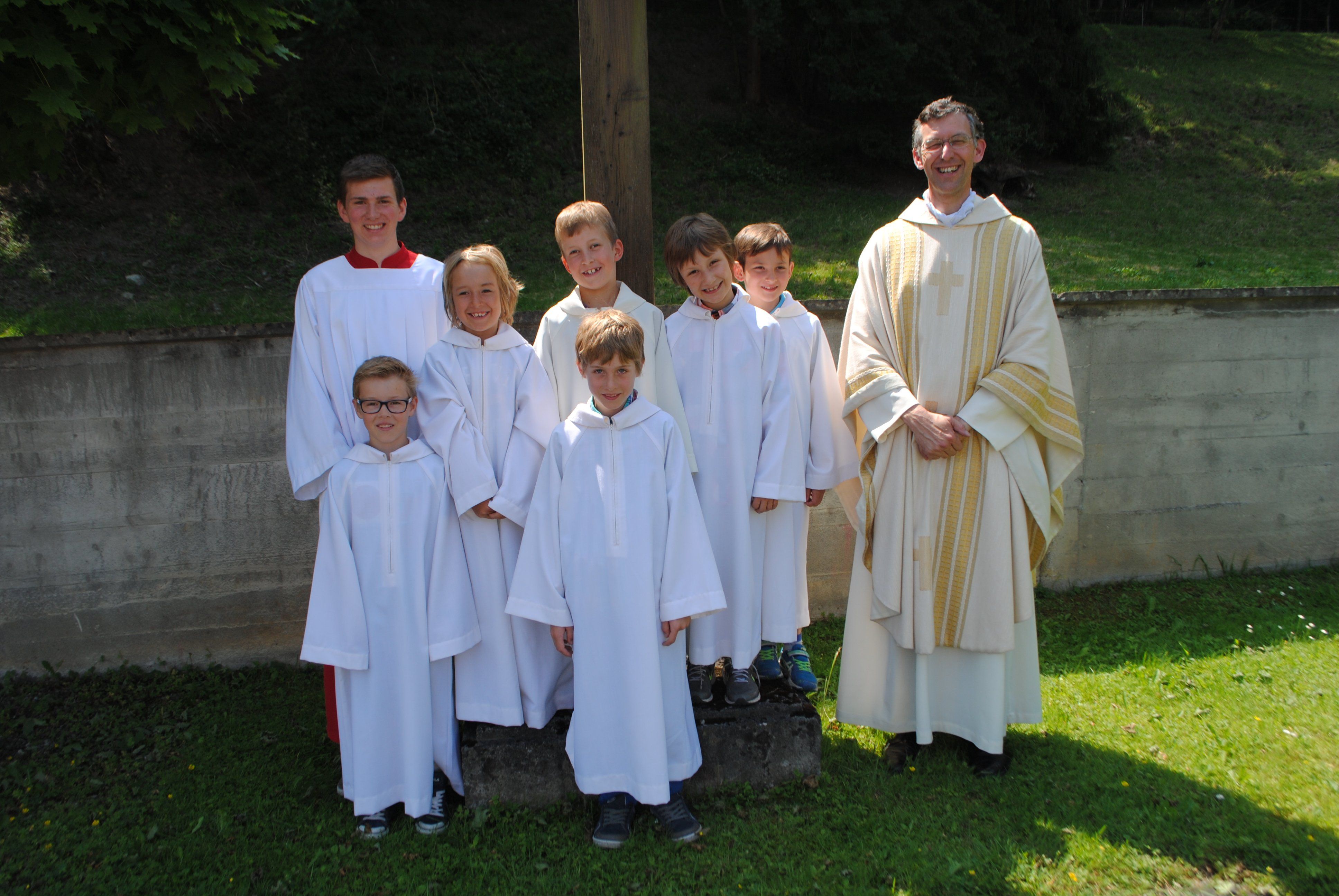 Ministrantenleiter Thomas Erlacher und Pater Thomas Felder mit den neuen Gisinger Ministranten.