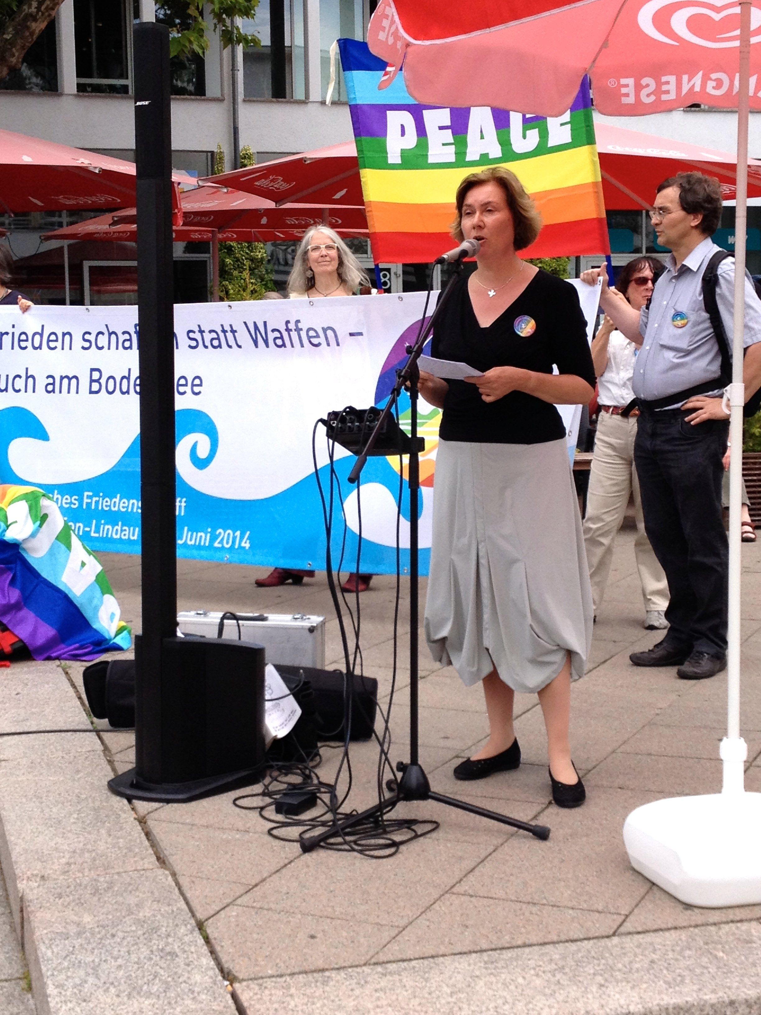 Oberkirchenräten Karen Hinrichs forderte während des Geläutes der Glocken der Friedrichshafener Kirchen, dass "...dass Deutschland mehr Verantwortung und Engagement im Bereich der zivilen Konfliktlösung und der Prävention übernehmen müsse: „Jedes Läuten von Glocken möge uns ermutigen, unsere Hoffnung stärken und uns erinnern an den Auftrag, den wir haben: Sucht den Frieden und jaget ihm nach.“