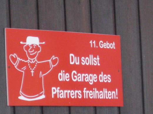 Dieser Hinweis des "elften Gebotes" hängt an der Garage des Pfarrers.