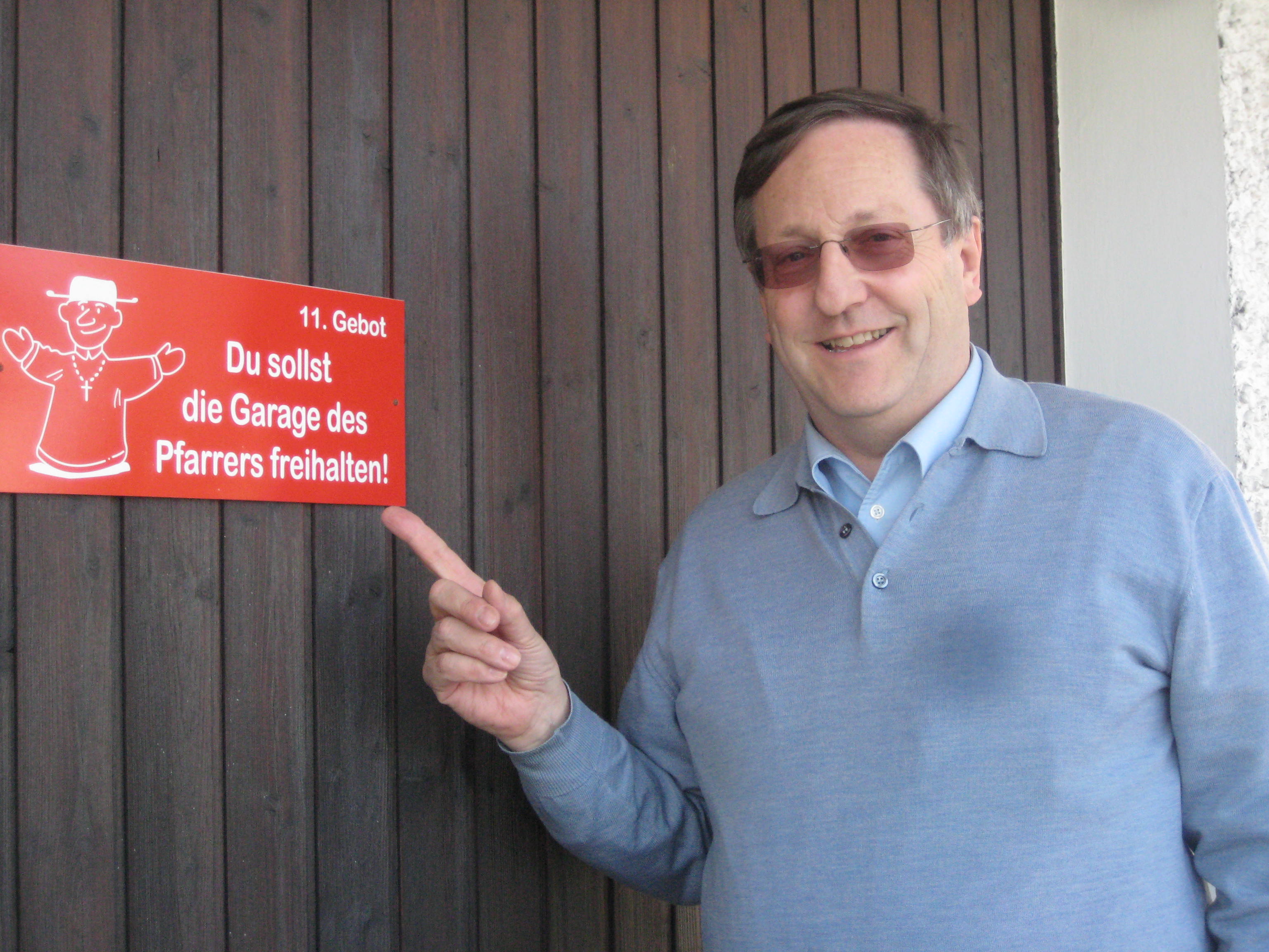 Dieser Hinweis "des elften Gebotes" hängt an der Garage des Pfarrers.