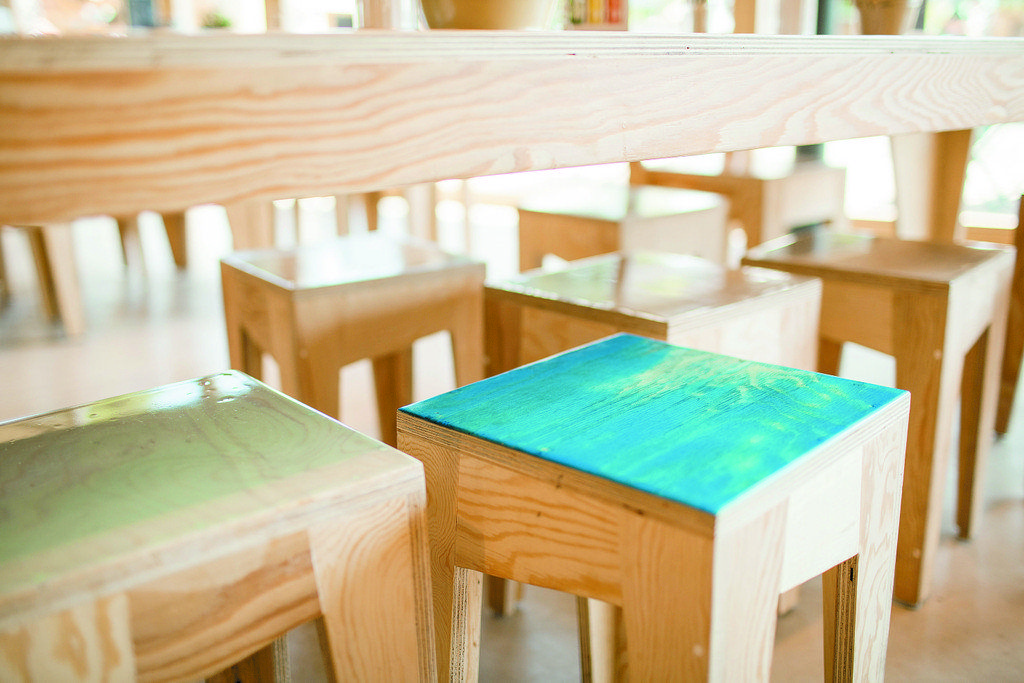 Für die Farbgestaltung der Hocker wie der Stühle im Biergarten vor dem Lokal hat die Gräfin unterschiedliche Blautöne des Bodensees an Land geholt.