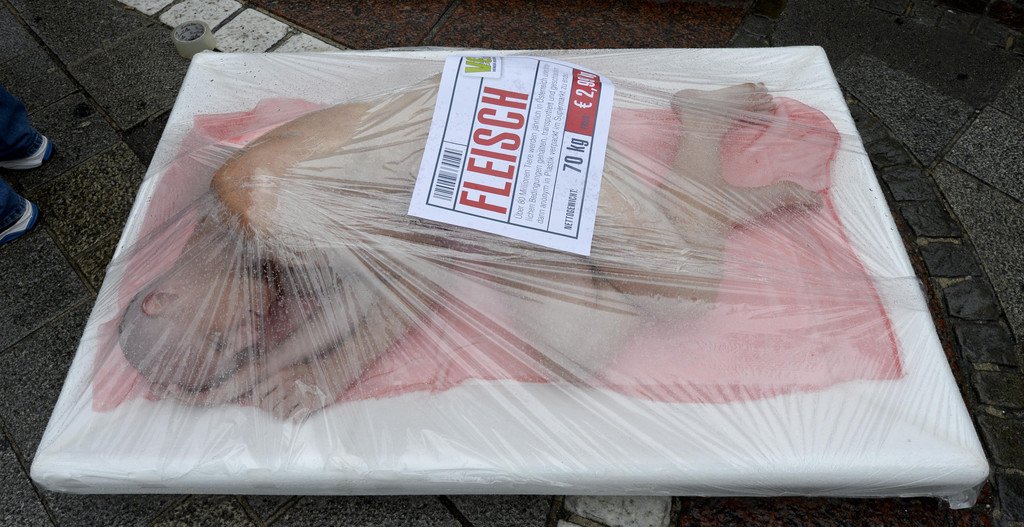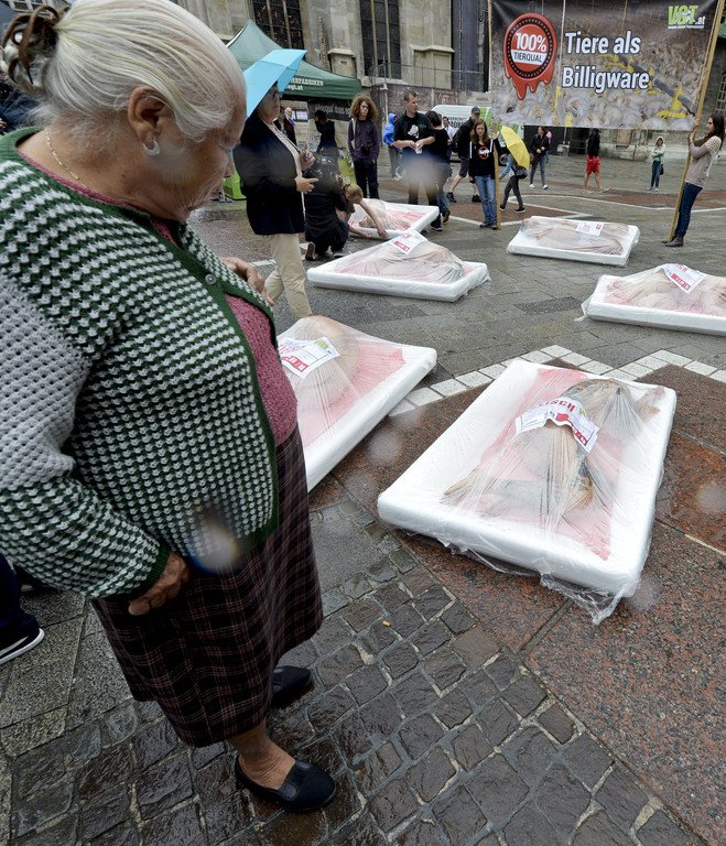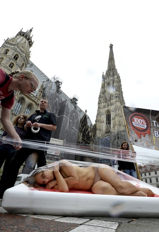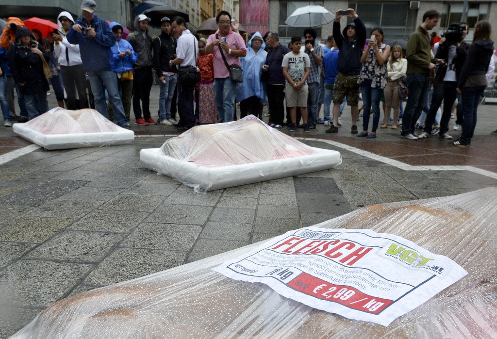 Protest in Wien: Nackte Tierschützer ließen sich als Fleisch verpacken