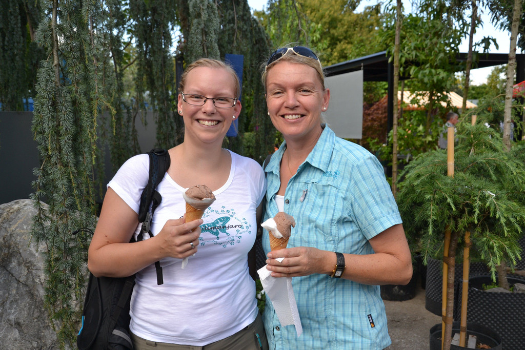 Melissa und Doris Langer genießen ein Eis von der Silvretta Eisdiele im schönen Ambiente des Ideenparks