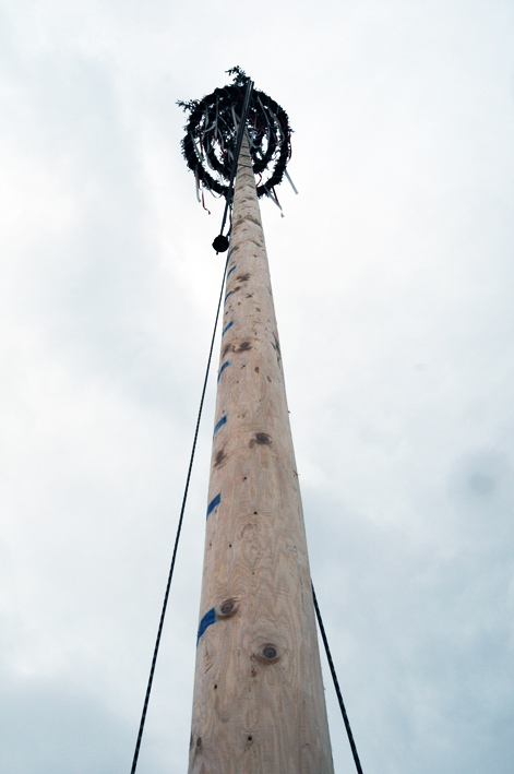 Maibaum vor wolkenverhangenem Himmel